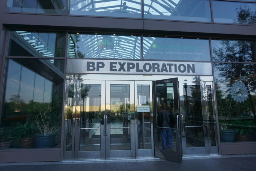 The entrance of what was then the BP Exploration (Alaska) Inc. building in Midtown Anchorage is seen on Aug. 27, 2019, just after the company announced its plan to sell off all its Alaska assets. The slogan above the door reads: “Prudhoe Proud: Pioneering the Past, Fueling Alaska’s Future.” BP drew up two separate development plans for Liberty. In 2014, it sold half of the project share to Hilcorp, and Hilcorp became the unit’s operator. In 2020, Hilcorp assumed full ownership of Liberty, along with ownership of all remaining BP assets in Alaska. (Photo by Yereth Rosen/Alaska Beacon)