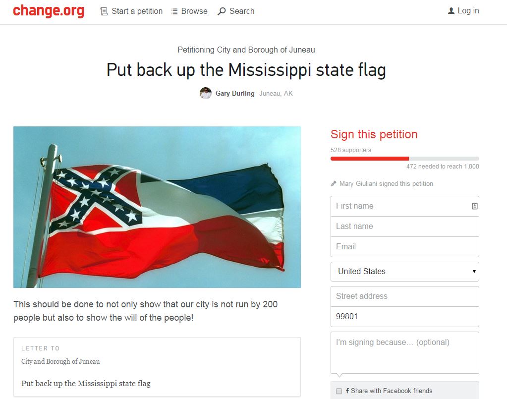 More than 800 people have signed a petition created Tuesday to put the Mississippi flag back up in downtown Juneau, just days after it was removed over its Confederate imagery.