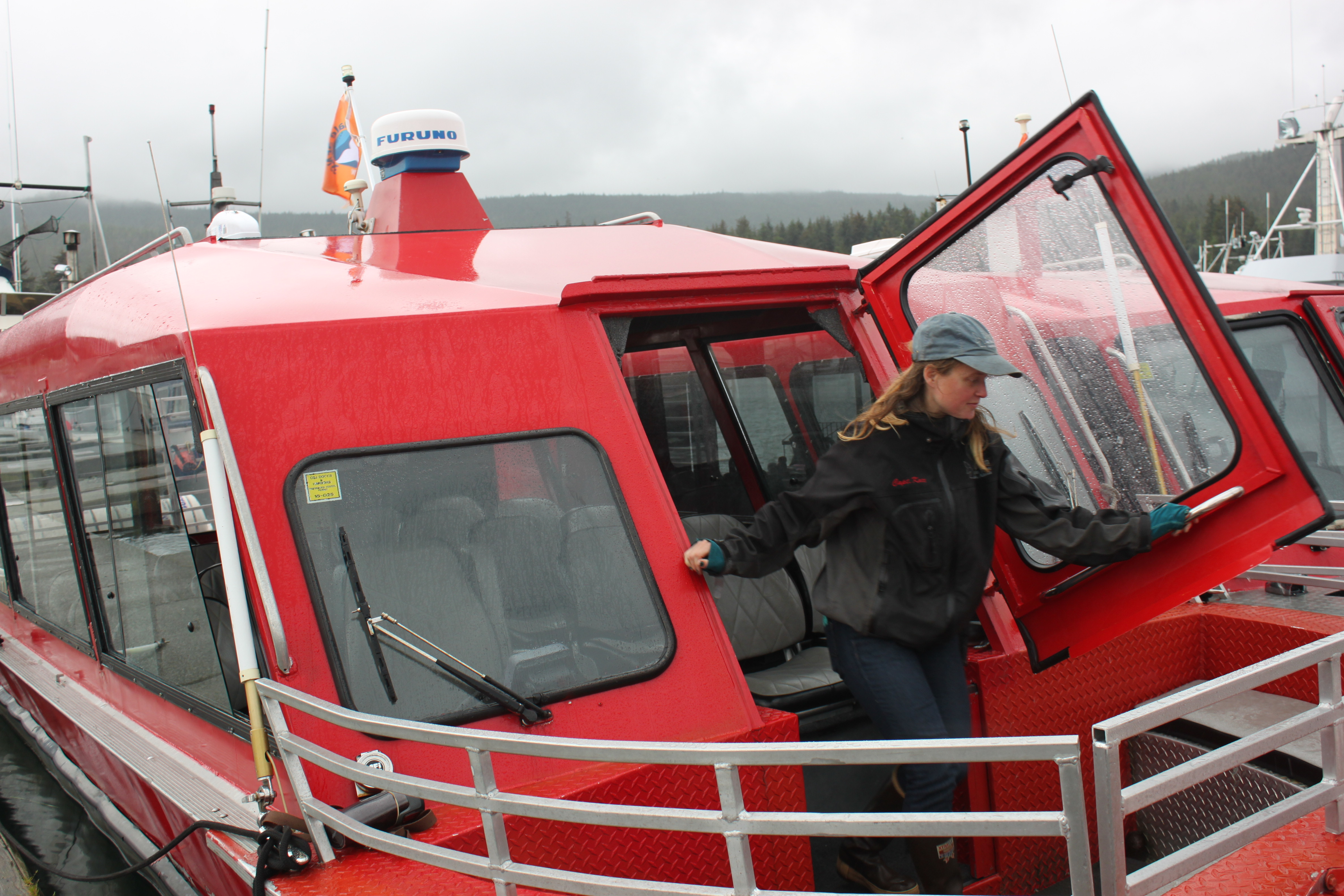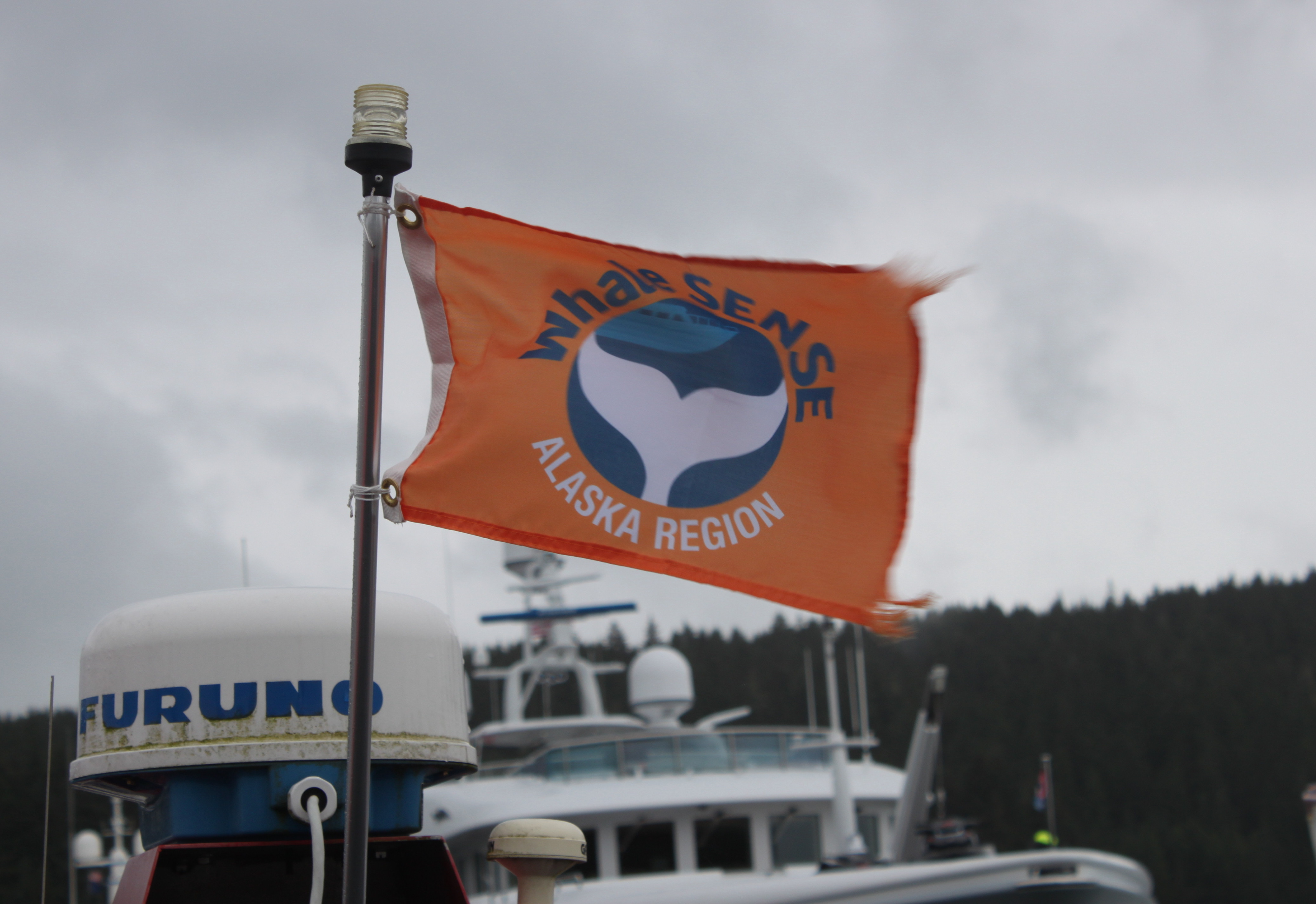 It’s a windy day at Statter Harbor in Juneau, where Dolphin Jet Boat Tours stage trips. A new orange Whale SENSE flag adorns each vessel, “so that other boats on the water can see that we’re a member of Whale SENSE and then they know that we’re well trained and carefully observing all the guidelines and protecting the whales,” says Kathleen Turley, port captain for Dolphin. She’s been with the company for 12 years and does everything from maintaining the boats to being an on-board naturalist.