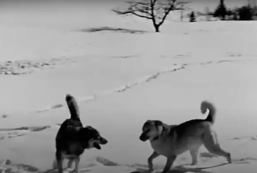 A 1940s Pictoreels film depicts Chinook sled dogs , a popular breed at the time, frolicking in New Hampshire snow. (Courtesy of Pictoreels)