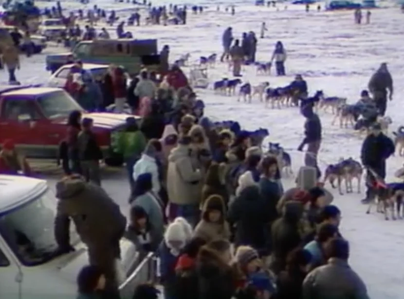 Spectators gather and dogs bark eagerly at the 1988 Kuskokwim 300 start line. (KYUK File)