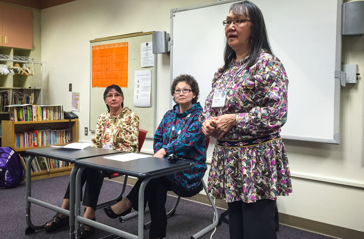 Emma Olanna, Lucy and Edna Apatiki address an audience of regional leaders at Kawerak’s Rural Providers Conference in Nome Monday. (Photo by Francesca Fenzi/KNOM)
