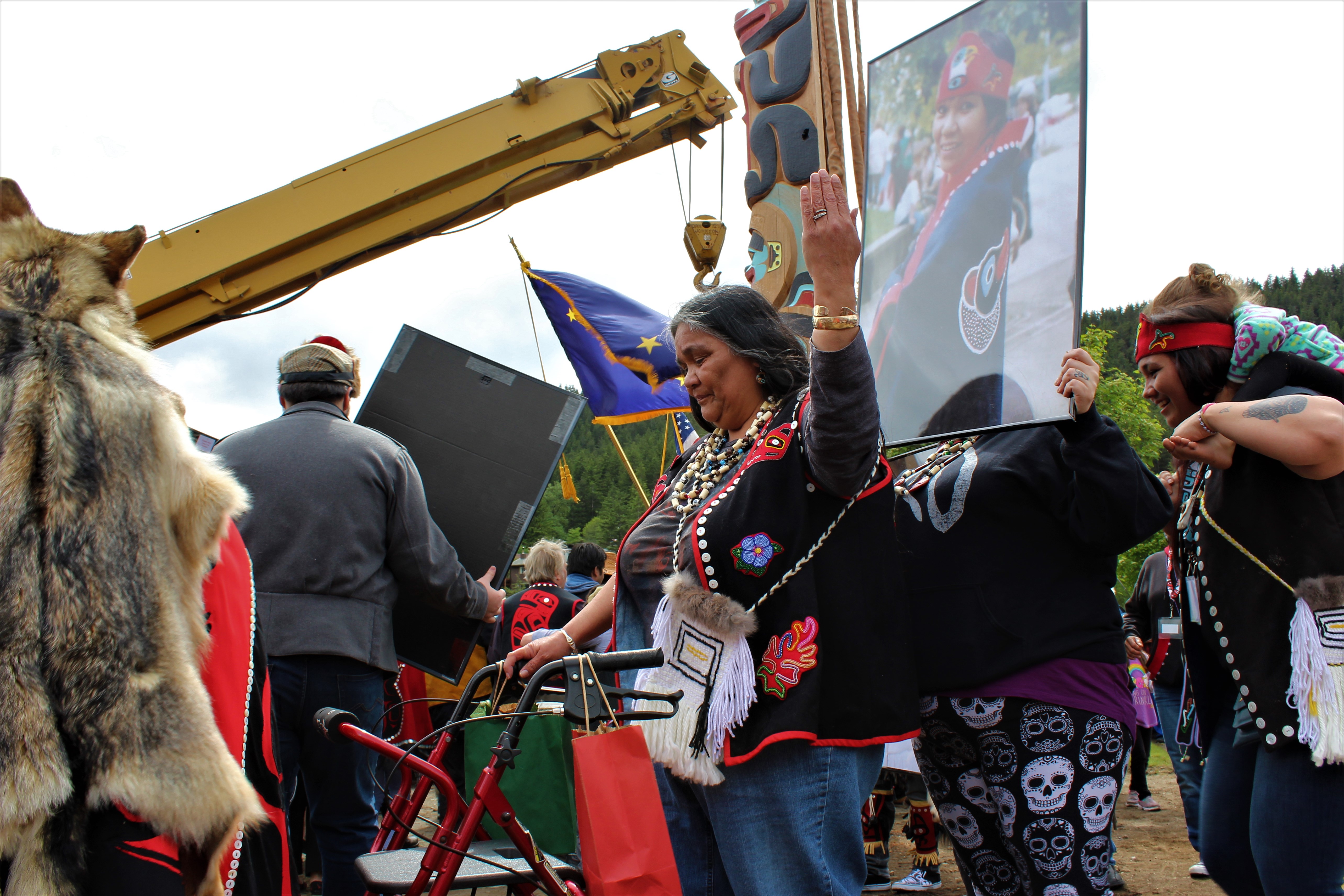 Members of the T’aaḵú Ḵwáan gathered Wednesday at Savikko Park in Douglas for the raising of the Yanyeidì Gooch kootéeyaa, or Wolf totem pole.