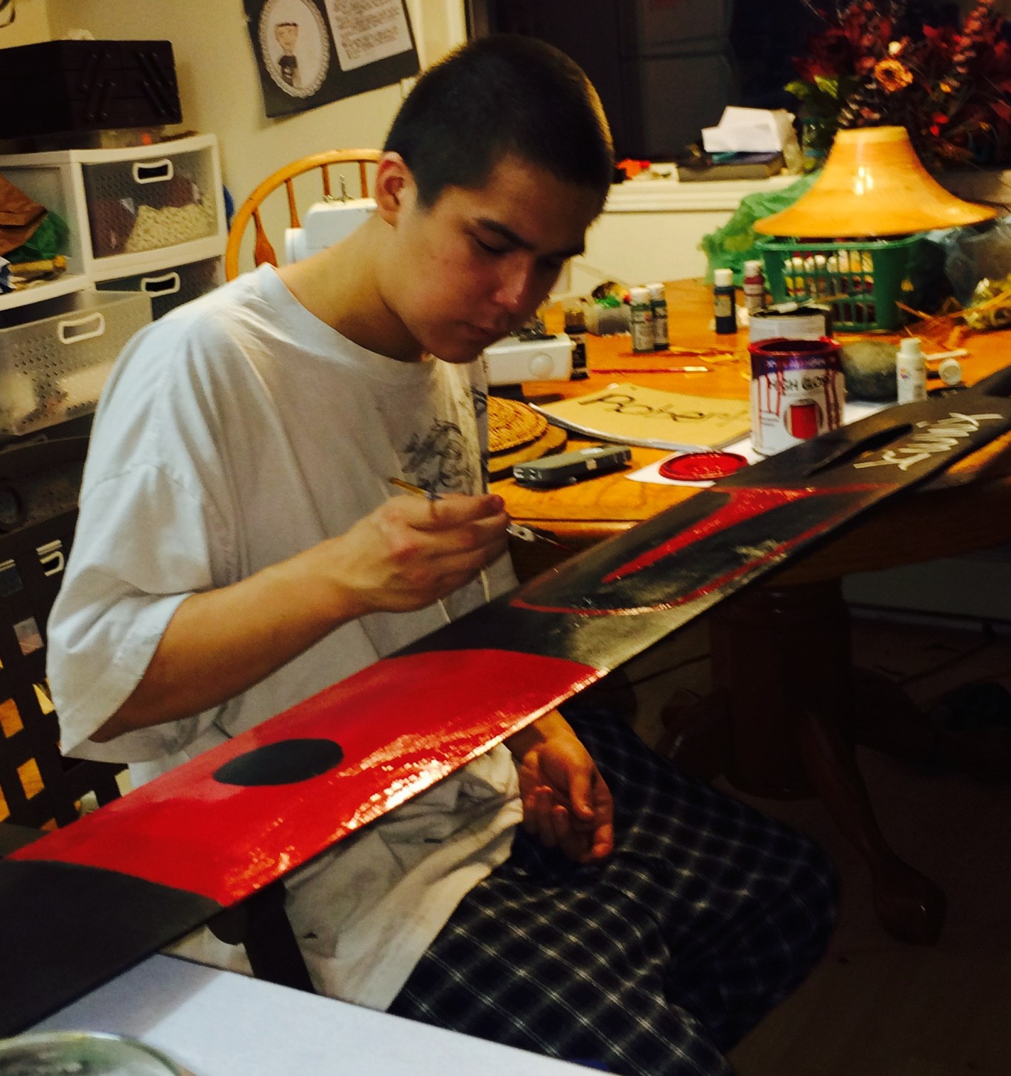 Wilbur Brown’s son paints detail on the dance paddle used in Celebration 2014. (Photo courtesy of Wilbur Brown)