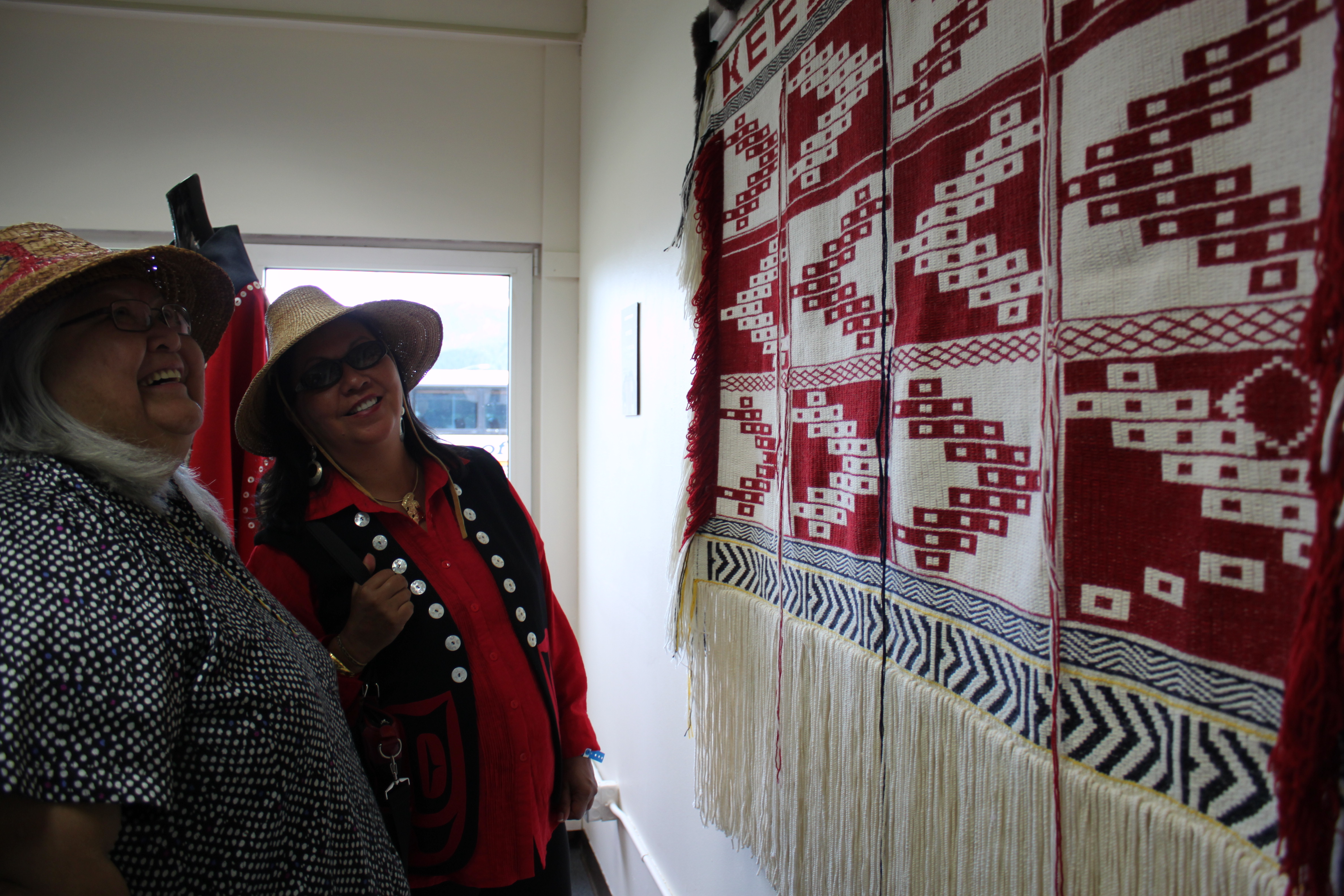 Della Cheney looks at the finished robe with a friend during the Sealaska Heritage Institute's Juried Art Show and Competition. Cheney was awarded second place in the Northwest Coast Customary-Inspired Art category. (Photo by Lisa Phu/KTOO)