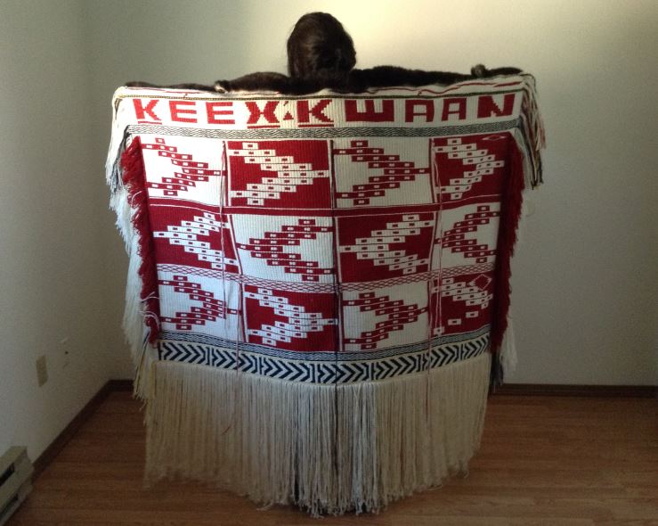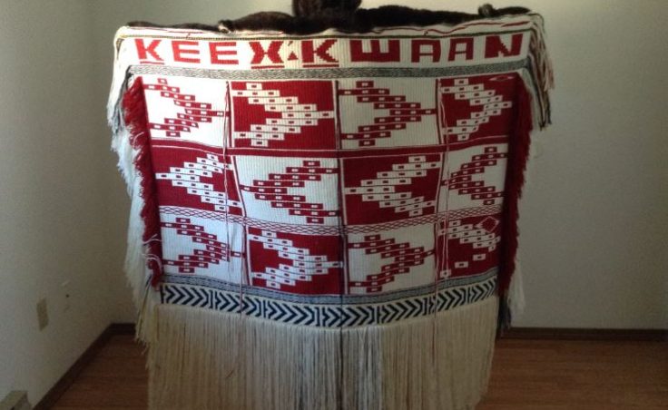 On the top of the robe, Cheney weaved the words Keex’ Kwáan in big, bold letters, which is Tlingit for their home village of Kake. This was Gail’s idea.