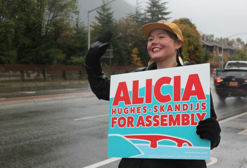 Hughes-Skandijs has been on the Assembly since 2019. On Tuesday morning, she stood by the Juneau-Douglas Bridge holding her campaign sign in one hand and Woll’s in the other.