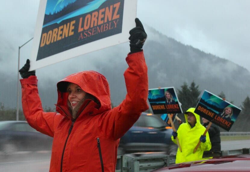 Areawide Assembly candidate Dorene Lorenz waves a campaign sign on Oct. 3, 2023. (Katie Anastas/KTOO)