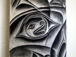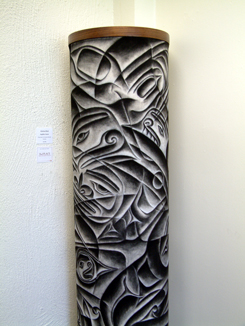 Rizal says her art was inspired by a dream. She used charcoal on canvas that is then wrapped around a custom built totem. The light spaces simulate the reflected light shining off argillite and the dark charcoal the carved areas.