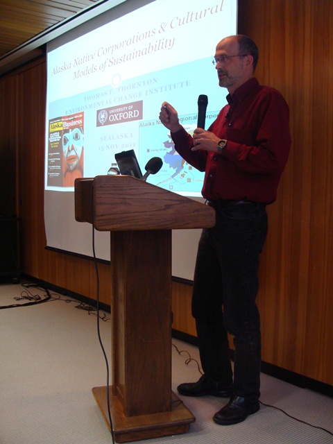 Tom Thornton is a senior research fellow for Environmental Change and Management at Oxford University. He presented some of his current research yesterday (Tuesday) at Sealaska Heritage Institute’s annual Native American History Month lecture series.