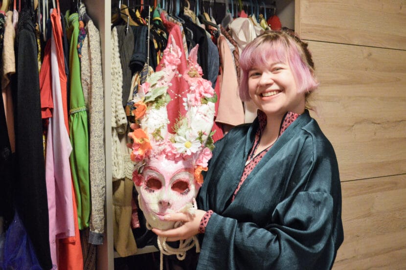 Maggie Hyde shows off a mask she made for Wearable Arts on Oct. 24, 2025. (Photo by Yvonne Krumrey/KTOO)