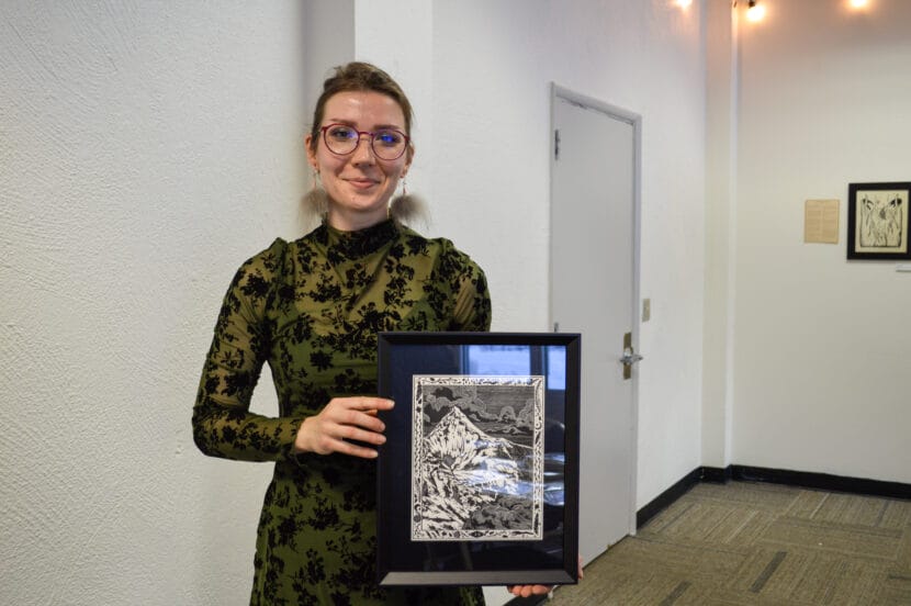 Alex Bookless holds a print she made on Jan. 2, 2025. (Photo by Yvonne Krumrey/KTOO)