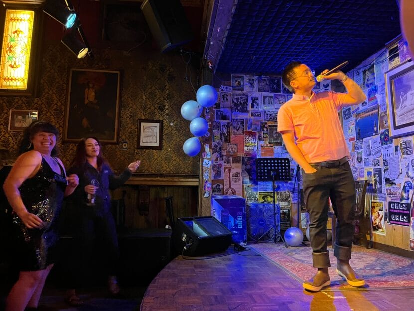 Rouel Dela Cruz performing karaoke at the Alaskan on May 22, 2024. (Photo by Yvonne Krumrey/KTOO)