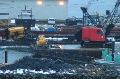 Yellow crane (far left) that toppled over on Thursday and another crane (red, far right) that was brought in to help with recovery - KTOO News photo