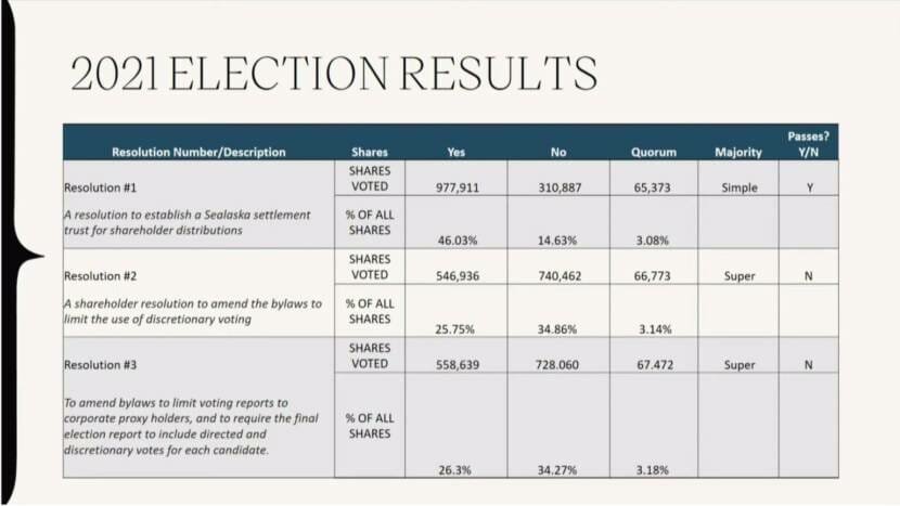 A screenshot of a report showing 2021 Sealaska election results for the corporation’s board. (Sealaska)