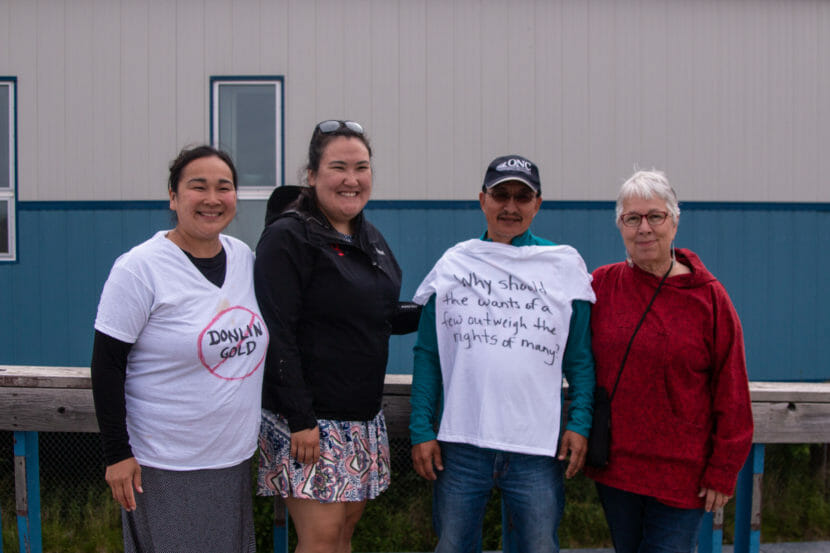 Beverly Hoffman, far right, poses with fellow opponents of the Donlin Mine in Bethel. The mine is proposed for development in the hilly terrain near the Kuskokwim River. (Photo provided by SalmonState)