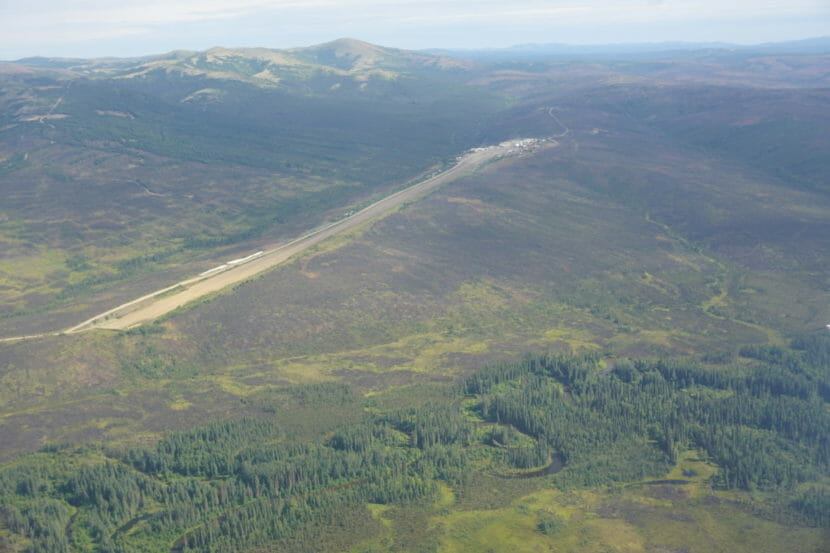 The Donlin Mine airstrip, with the camp at the far end, is seen from the air on Aug. 11. The mine site is in the hilly terrain near the Southwest Alaska’s winding Kuskokwim River. (Photo by Yereth Rosen/Alaska Beacon)