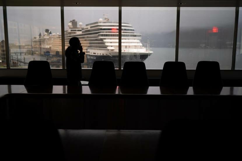 Sealaska CEO Anthony Mallott sits in the Sealaska boardroom on Monday, Sept. 13, 2021 in Juneau. Two docked cruise ships are visible behind Mallott. (Photo by Loren Holmes/ADN)