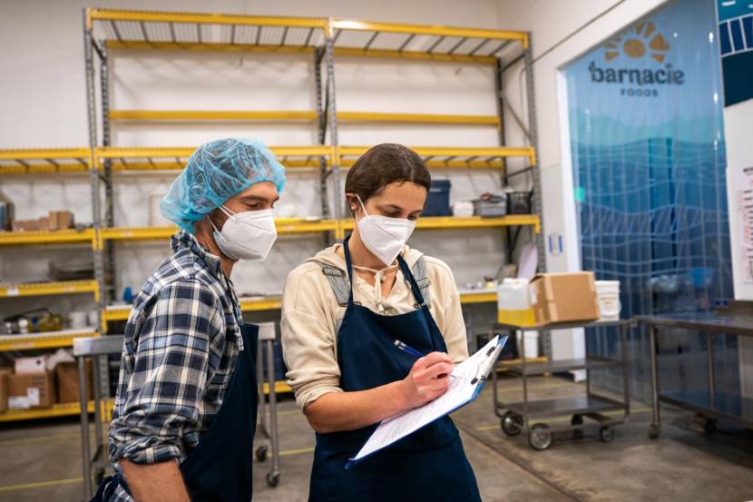 Barnacle Foods co-owners Matt Kern and Lia Heifetz look over a checklist at their production facility on Tuesday, Sept. 14, 2021 in Juneau. (Loren Holmes / ADN) ONE TIME USE