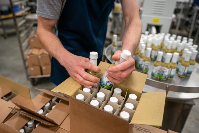 Barnacle Foods co-owner Max Stanley boxes bottles of Bullwhip Kelp and Serrano Hot Sauce at the Barnacle Foods production facility on Tuesday, Sept. 14, 2021 in Juneau. (Photo by Loren Holmes / ADN)