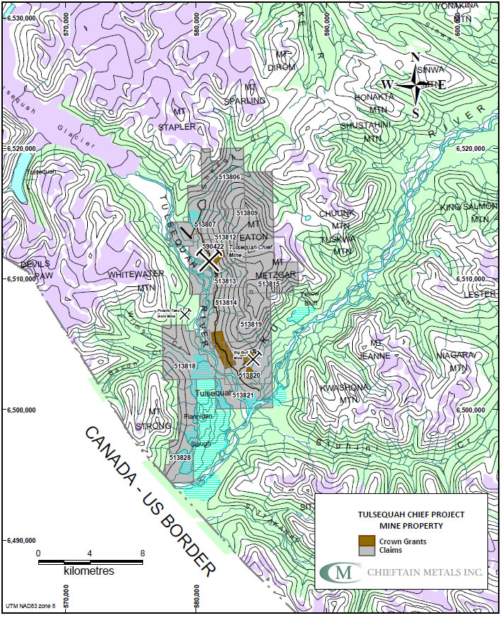 The Tulsequah Chief Deposit is located at an elevation of approximately 110 metres above sea level. The Tulsequah Project covers a total area of approximately 14,220 hectares and is comprised of 13 mineral claims and 25 Crown-granted claims.