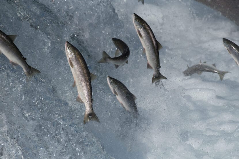 Salmon returning from the ocean attempt to jump Brooks Falls in Katmai National Park and Preserve’s Brooks River on July 12, 2018. Alaska’s commercial salmon harvest this year was nearly twice as big as last year’s small harvest. (Photo by Russ Taylor/National Park Service)