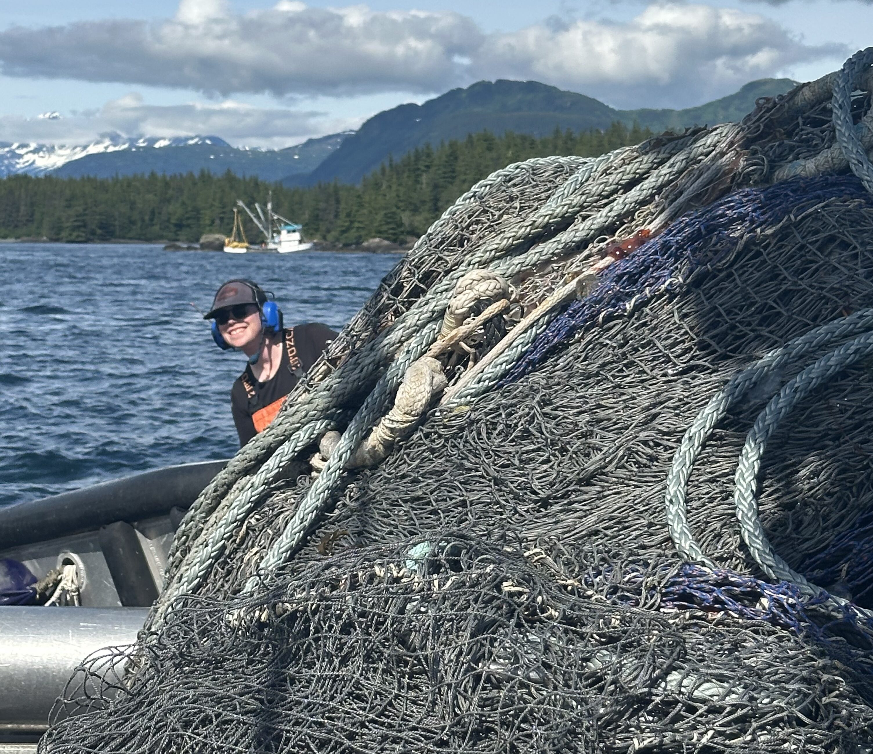 Rowan Miller peeks out from behind a fishing net while seining in Prince William Sound. (Photo courtesy of Rowan Miller)
