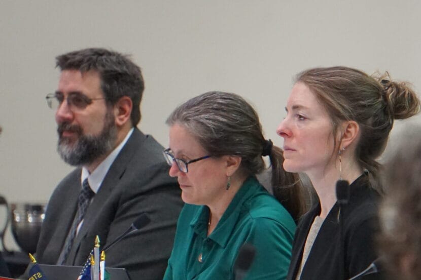 North Pacific Fishery Management Council member Nate Pamplin, Diana Evans, the council’s executive director, and council chair Angel Drobnica listen to testimony on Feb. 7, 2026, at the February meeting in Anchorage. (Photo by Yereth Rosen/Alaska Beacon)
