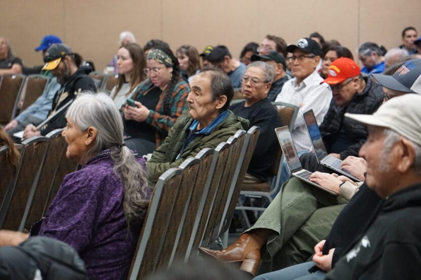 Audience listens to testimony Feb. 9, 2026, at the North Pacific Fishery Management Council meeting in Anchorage. Subsistence fishers from the Yukon and Kuskokwim river basins were among those attenting the meeting and giving public testimony about bycatch of chum salmon in the Bering Sea pollock fishery. Also attending the meeting were people involved in the pollock industry. Public testimony on the issue to the full council stretched over four days. (Photo by Yereth Rosen/Alaska Beacon)