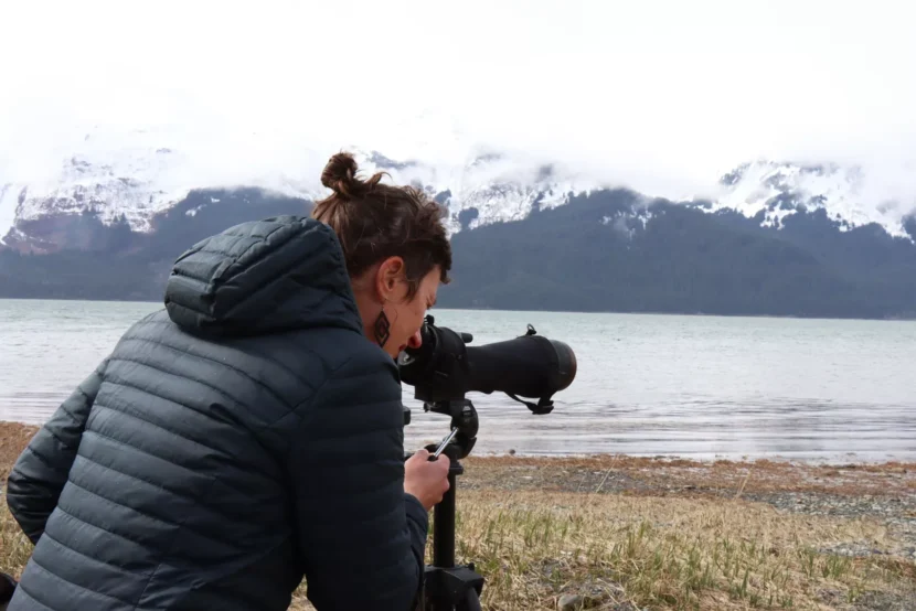 Which is why it’s also important to monitor other species’ activity. Stacie Evans is the science director of the Takshanuk Watershed Council, a local nonprofit that partners with the tribe to track the run on the Chilkat River. Every day when she heads out to get water samples, she also does a wildlife survey.