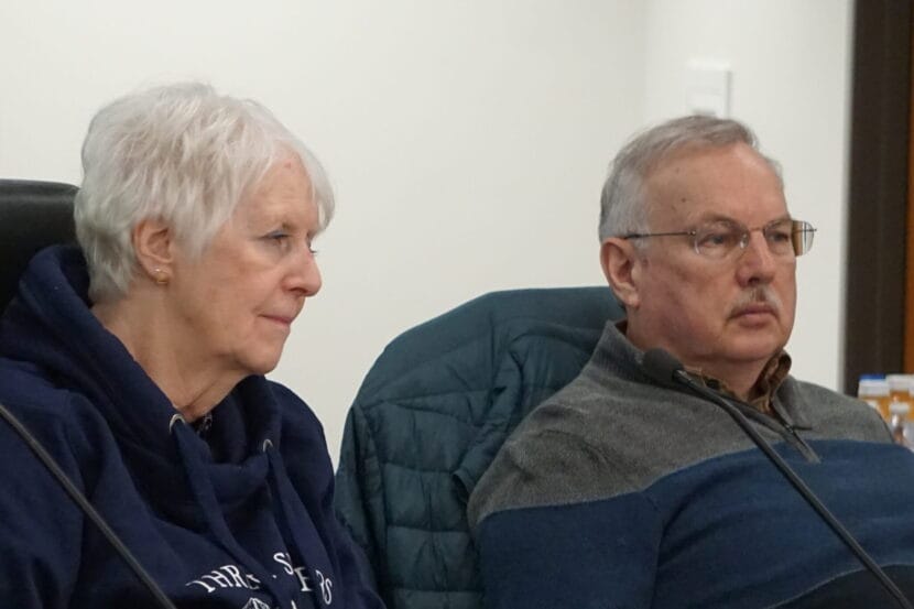 Rep. Louise Stutes, R-Kodiak, and House Speaker Bryce Edgmon, I-Dillingham, listen to information on Jan. 9, 2025, at an Anchorage hearing of the Joint Legislative Task Force Evaluating Alaska’s Seafood Industry. Stutes and Edgmon are two of the task force’s eight members. (Photo by Yereth Rosen/Alaska Beacon)