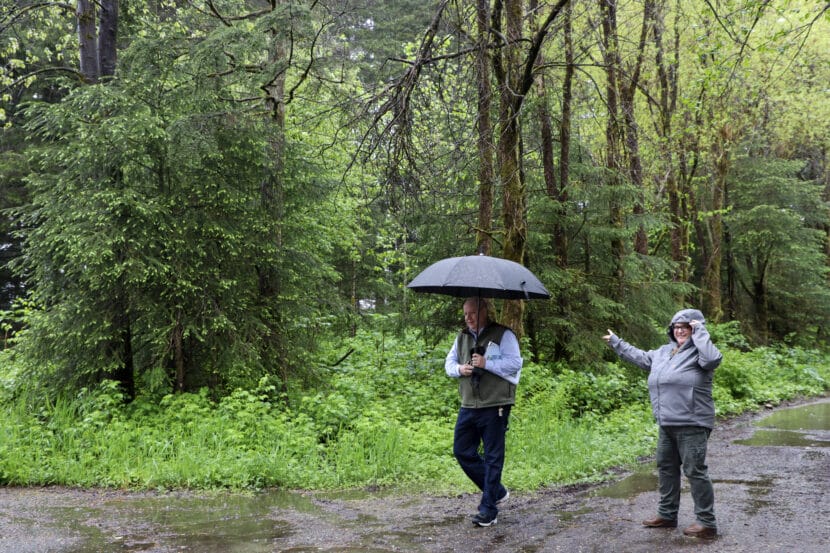 Jonathan Swinton and Stephanie Carter with Gastineau Human Services walk past the location where a Juneau affordable housing project was scheduled to begin construction last month. Wednesday, May 29, 2025. (Photo by Clarise Larson/KTOO)