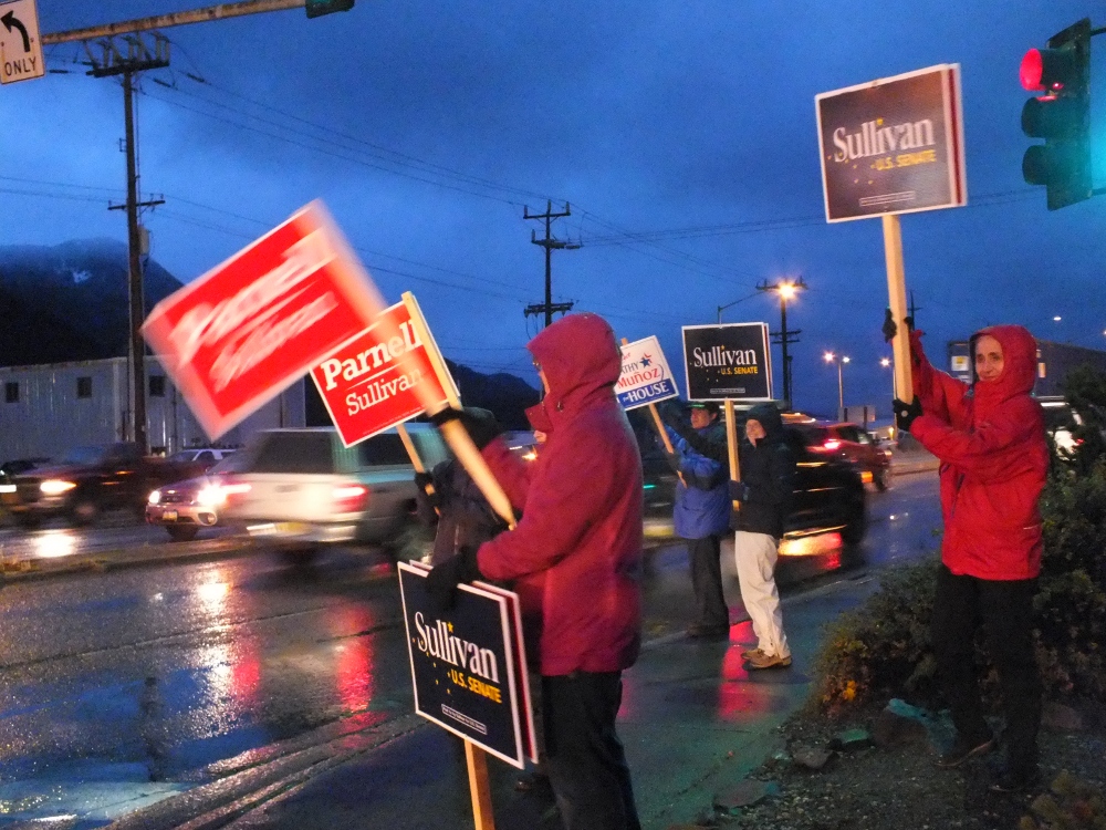Republican sign wavers at 10th Street and Egan Drive in Juneau try to get the attention of evening commuters on Election Day. Capital city voters broke toward Democratic candidates in Alaska’s Congressional races. (Photo by Matt Miller/KTOO)