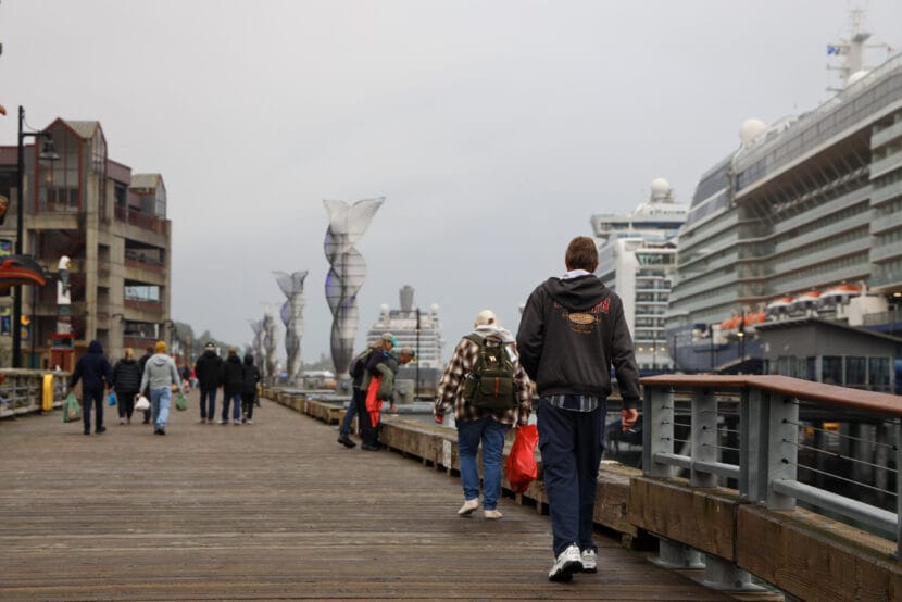 Cruise ship visitors walk the docks in downtown Juneau on Monday, April 14, 2025. (Photo by Clarise Larson/KTOO)