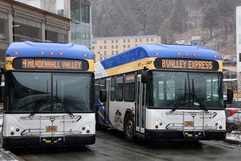 Electric Capital Transit buses await passengers at the downtown transit center on Monday, March 17, 2025. (Photo by Clarise Larson/KTOO)