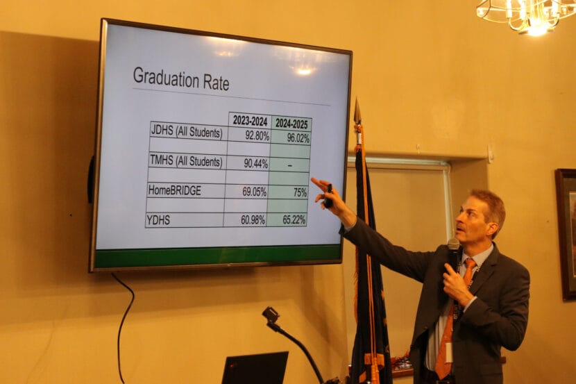 Juneau School District Superintendent Frank Hauser points at a screen with high school graduation rates at the Moose Lodge in Juneau on Oct. 16, 2025. (Photo by Jamie Diep/KTOO)