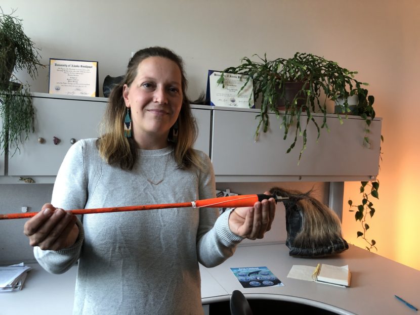 Suzie Teerlink holding a whale blubber sampling dart. Sept. 16, 2022. (Photo by Yvonne Krumrey/KTOO).
