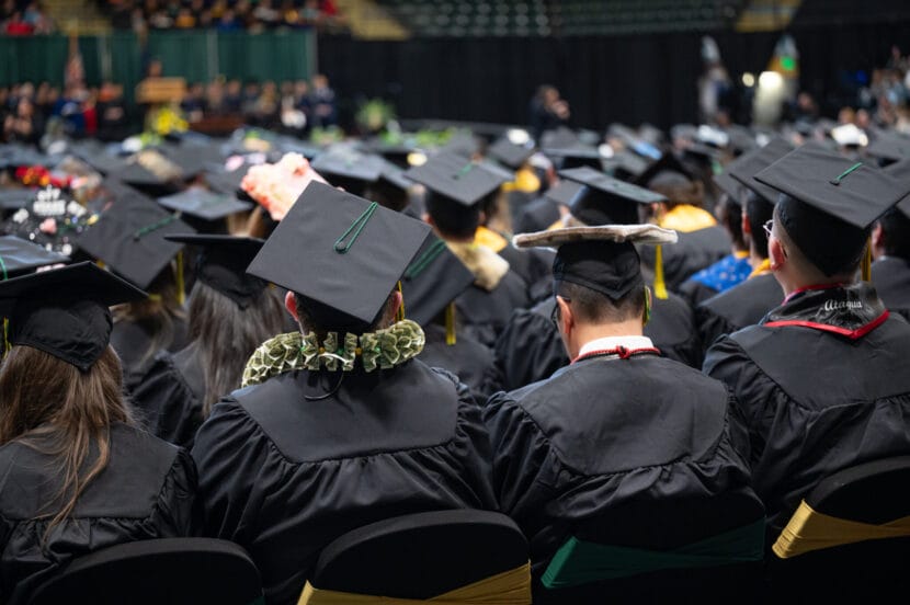 University of Alaska Anchorage graduates sitting in the crowd at the Alaska Airlines Center. (Matt Faubion / Alaska Public Media)