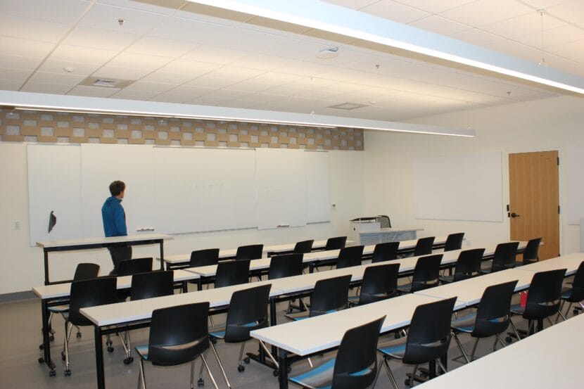 Eran Hood in a brand new 40-student seminar room (Photo by Anna Canny/KTOO)