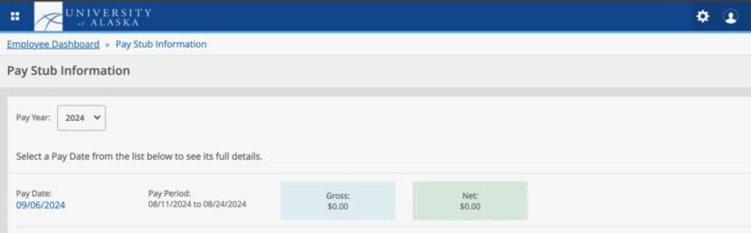 One University of Alaska Anchorage employee’s pay stub information for the Aug. 11-24, 2024 pay period.