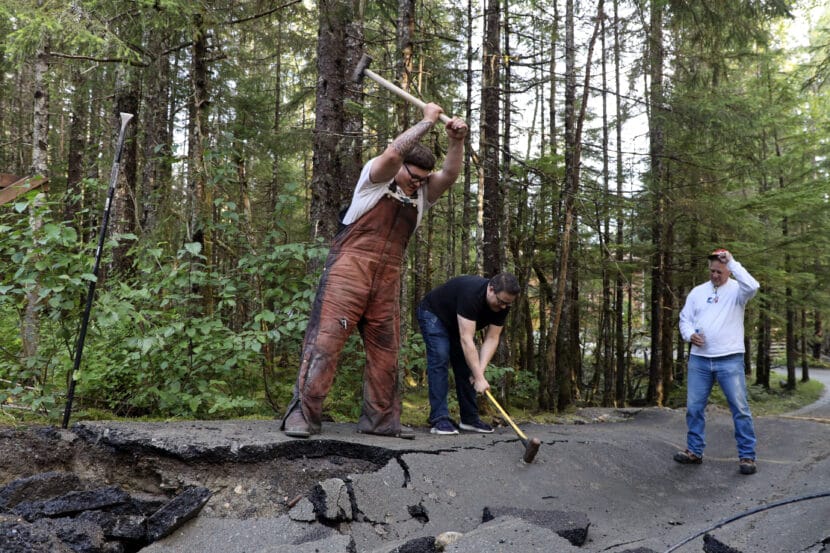 Parker Fenumiai, left, and Donovan Grimes, right, use sledge hammers to smash up a driveway damaged by flood waters on View Drive on Wednesday, Aug. 13, 2025. (Photo by Clarise Larson/KTOO)