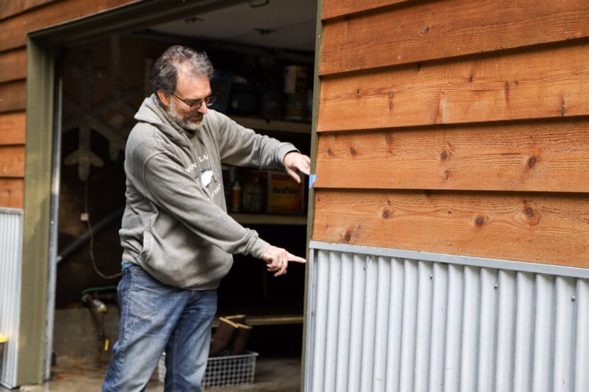 Douglas Smith compares the flood heights between 2024, bottom finger, and 2025, top finger, at his home on View Drive on Wednesday, Aug. 13, 2025. (Photo by Clarise Larson/KTOO)