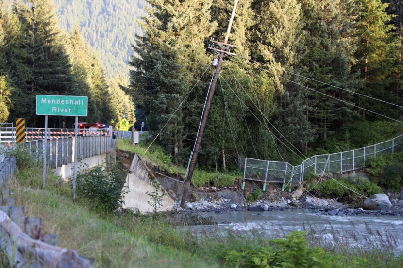 Back Loop Bridge is closed after flooding on the Mendenhall River on Wednesday, Aug. 13, 2025. (Photo by Clarise Larson/KTOO)