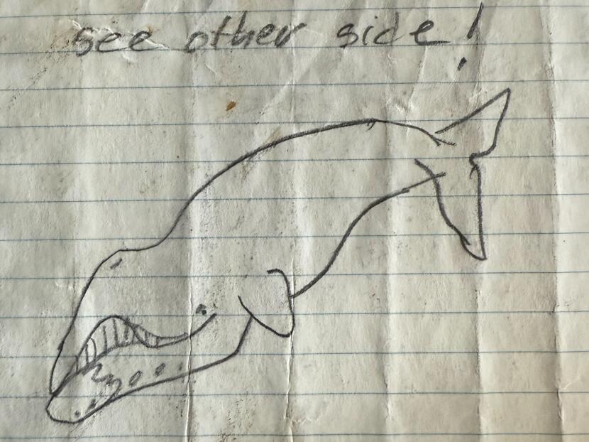John Craighead George had drawn a whale on the back of the note that he released in a bottle in 2019. (Photo by Julie Watkins)