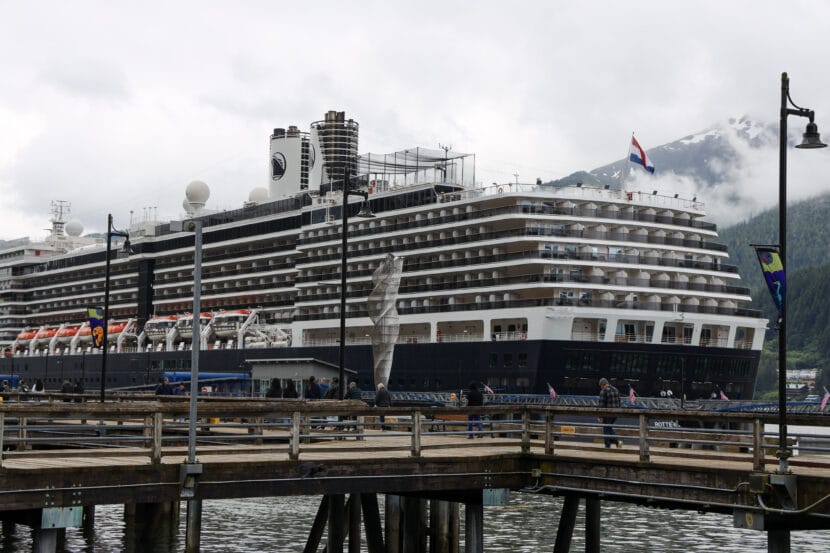 Holland America’s Noordam cruise ship in Juneau on Wednesday, July 9, 2025. It operates an open-loop exhaust scrubber and was found to violate federal water quality standards on 30 days in 2024, according to an EPA data analysis by SEACC. (Photo by Clarise Larson/KTOO)