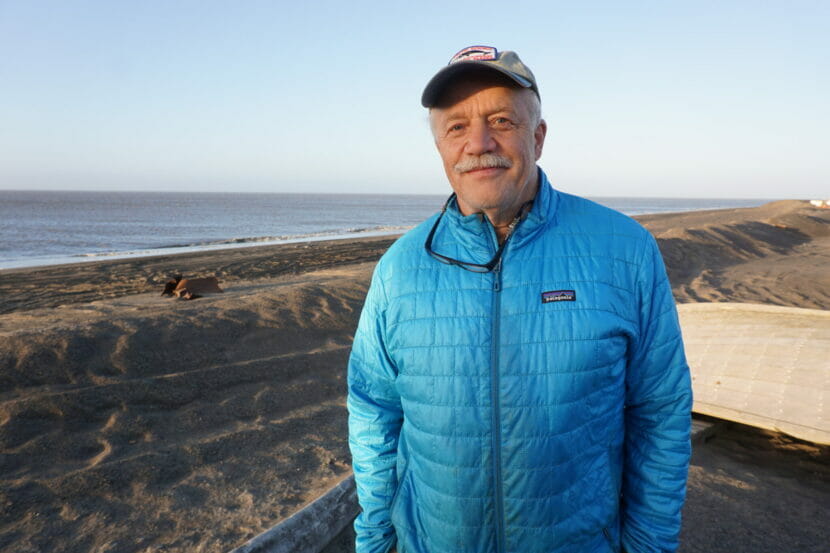 Biologist Craig George stands on Utqiagvik’s beach on Oct. 4, 2018. George, who went missing while rafting the Chulitna River last week, devoted much of his research to the effects of sea-ice loss. In past decades, the waters here would have been frozen over by October; in 2018, there was no ice within sight. (Photo by Yereth Rosen/Alaska Beacon)
