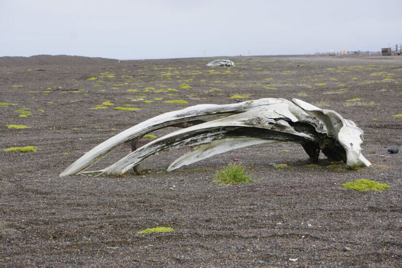 A bowhead whale skull, seen on Aug. 6, 2022, is one of several displayed on the beach at Utqiagvik. Bowhead skulls are thick enough to break through sea ice, and they are among the characteristics that allow the whales to thrive in Arctic waters. Bowhead hunting is an important part of Inupiat culture. (Photo by Yereth Rosen/Alaska Beacon)