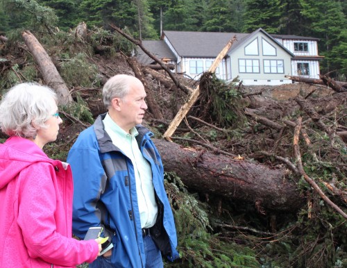 Gov. Bill Walker (right) and Sitka Mayor Mim McConnell visited the site of the Kramer Avenue landslide on Wednesday, Aug.19. (Photo by Rachel Waldholz/KCAW)