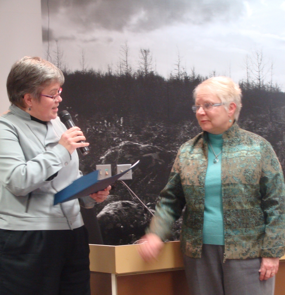 Juneau City Manager Kim Kiefer congratulates former Library Director Barbara Berg on her retirement at a CBJ Assembly meeting in early 2013. Photo by Casey Kelly/KTOO.