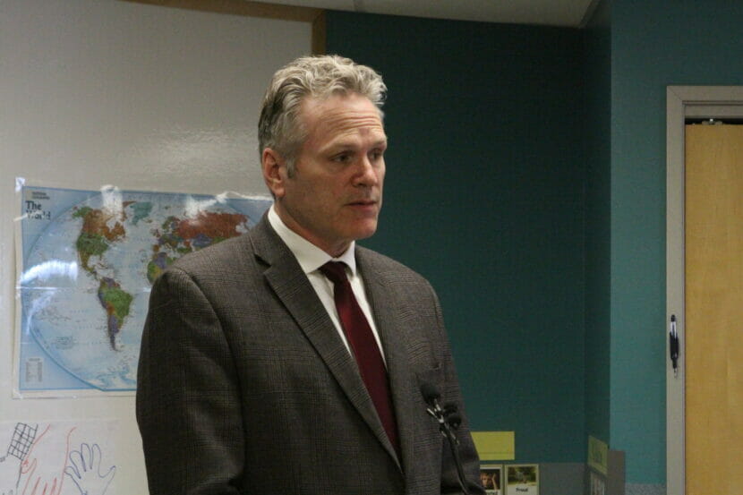Gov. Mike Dunleavy announces a state task force to address child care in Alaska on April 6, 2023. (Wesley Early/Alaska Public Media)